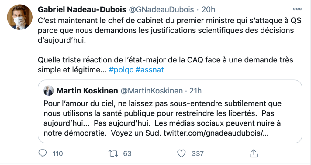 Le porte-parole du deuxième groupe d’opposition a demandé au gouvernement de montrer les justifications scientifiques de la recommandation de la santé publique au sujet du couvre-feu, et il s’est fait répondre qu’il entrait dans les théories du complot. … Exactement comme un partenaire de marde qui gaslight sa moitié parce qu’elle demande qui l’a texté. Belle transparence.