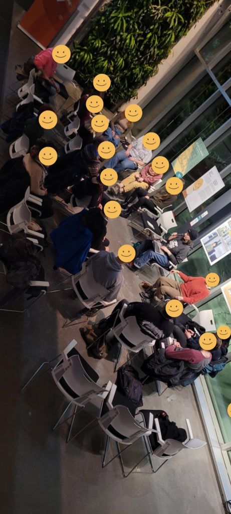À la fin de ce document, vous trouverez la structure complète de l’atelier, mais pour résumer, l’atelier commençait avec un tour de table pour se présenter (prénom et pronom) et expliquer pourquoi on avait décidé de venir à l’atelier. Puis, nous avons brisé la glace avec un bref exercice physique de brassage du corps pour évacuer le stress de la journée, nous connecter avec notre corps. Nous avons ensuite parler de nos principales préoccupations et des pistes d’espoir ou de solutions qu’on entrevoit. C’était ensuite la partie atelier où nous avons fait une méditation collective, puis un atelier créatif d’humour pour permettre à tout le monde de connecter en petit groupe et de finir sur une bonne note.